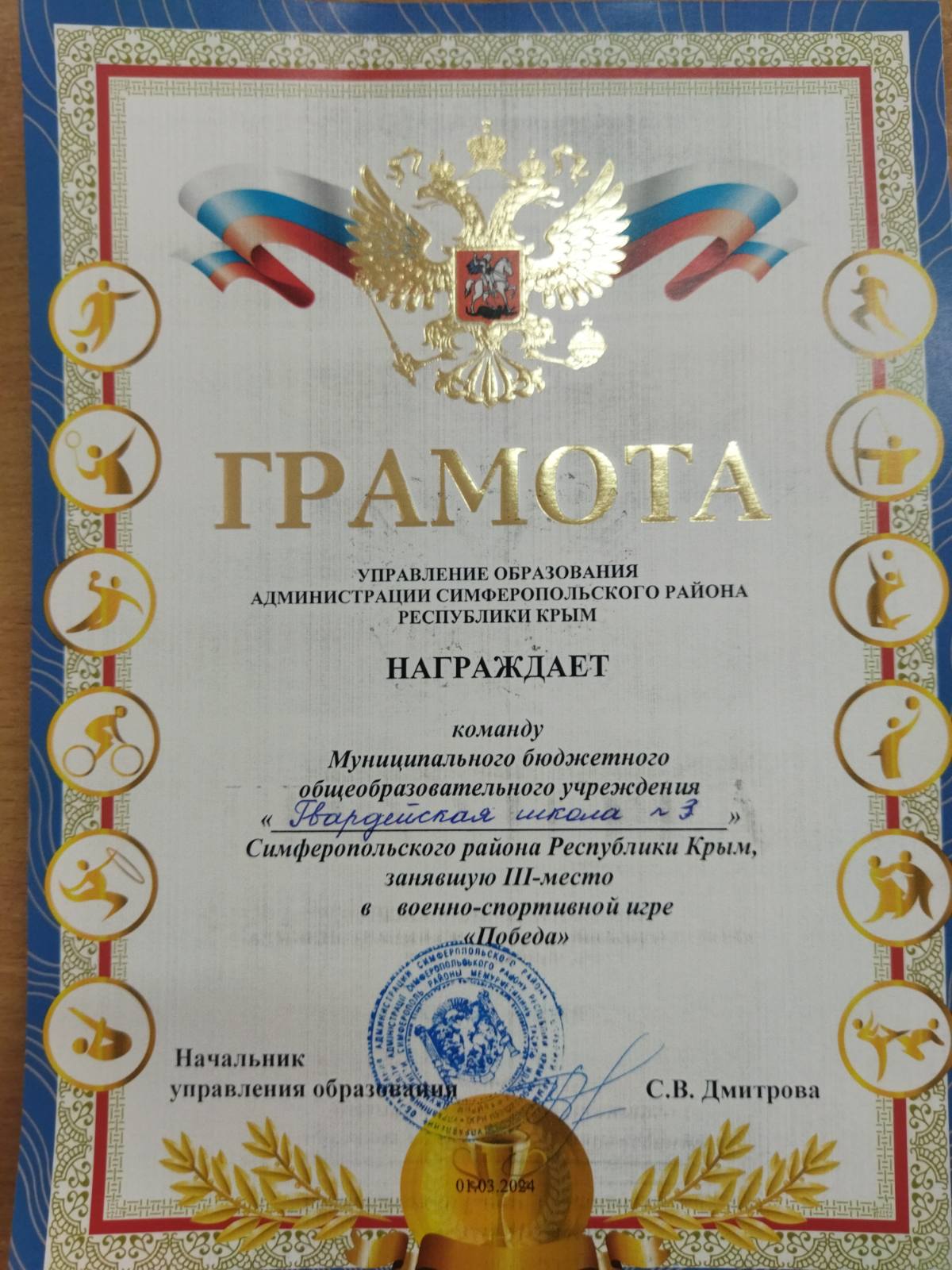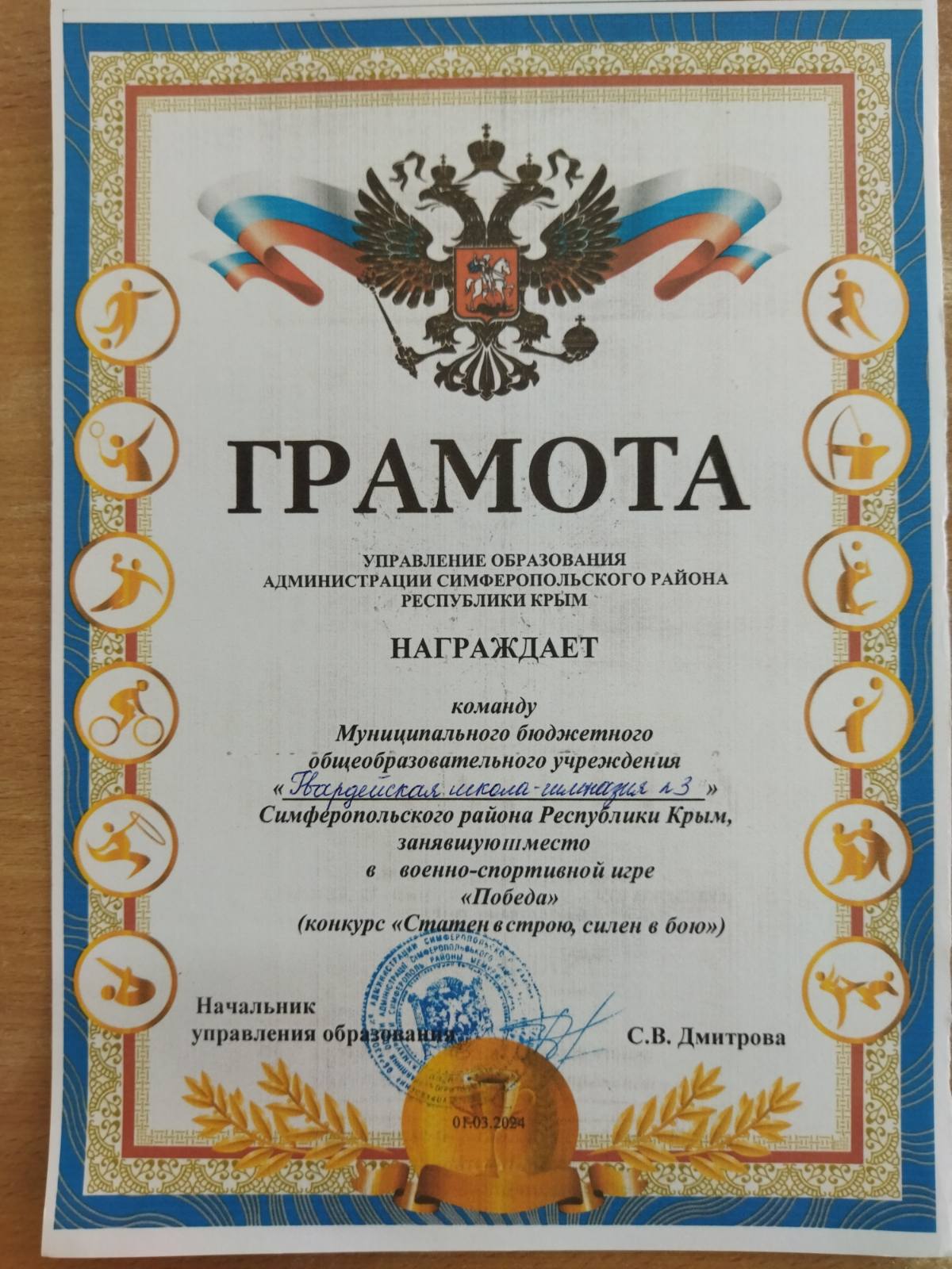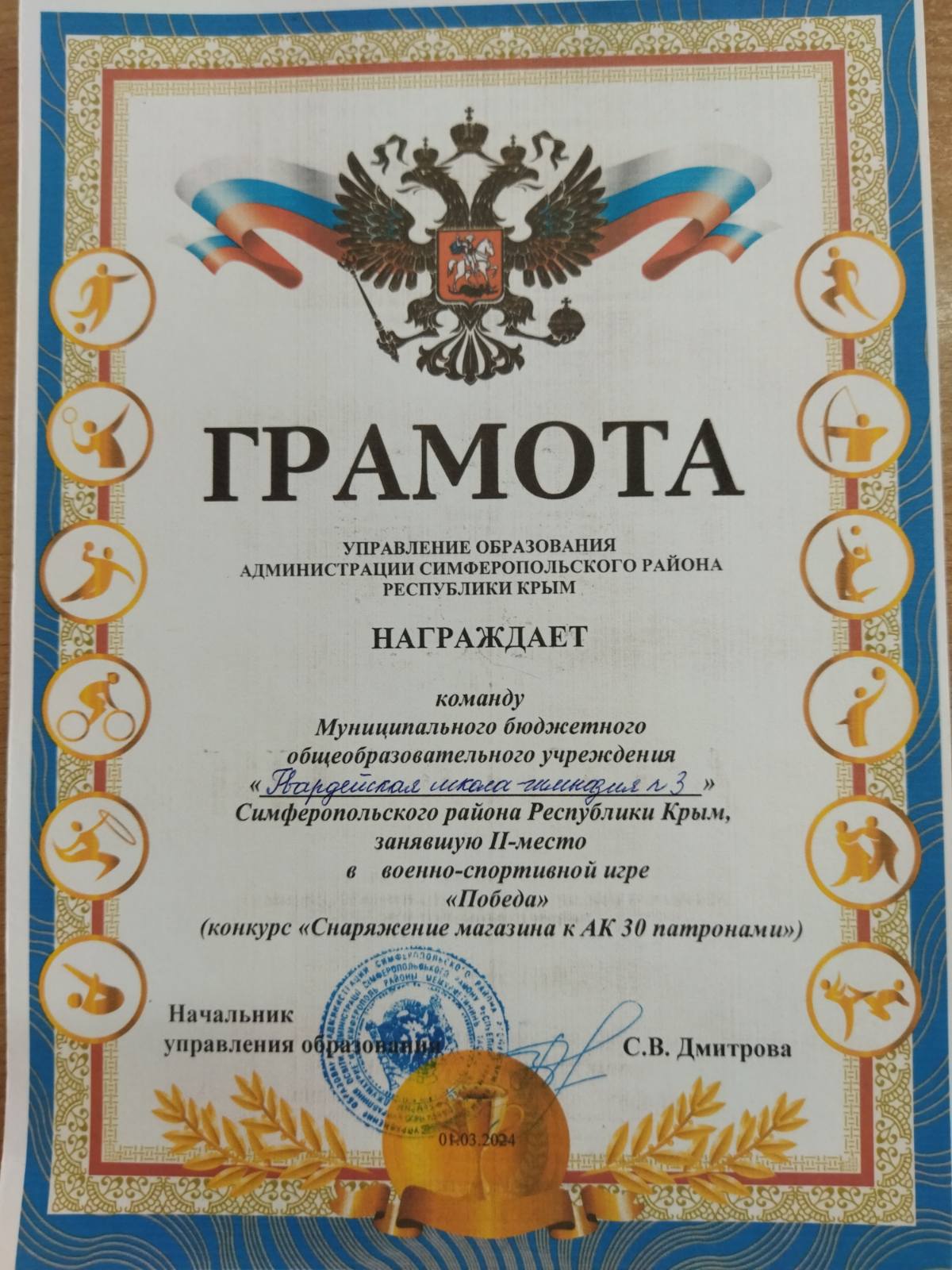 1 марта на базе МБОУ «Новоандреевская школа имени полного кавалера ордена Славы В.А. Осипова» Симферопольского района Республики Крым состоялся муниципальный этап Всероссийской детско-юношеской военно-спортивной игры «Победа» среди учеников старшего школьного возраста.