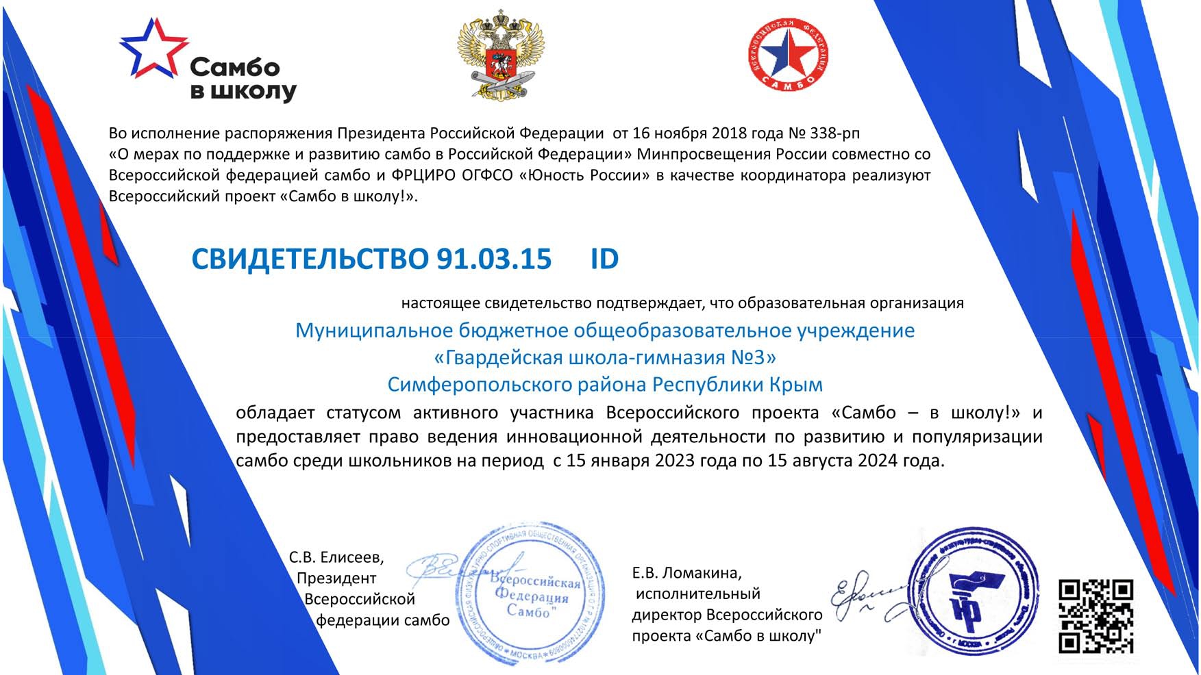В завершение семинара всем участникам были вручены сертификаты об участии в Республиканском семинаре-практикуме по реализации Всероссийского образовательного проекта «Самбо в школу» в общеобразовательных учреждениях Республики Крым.